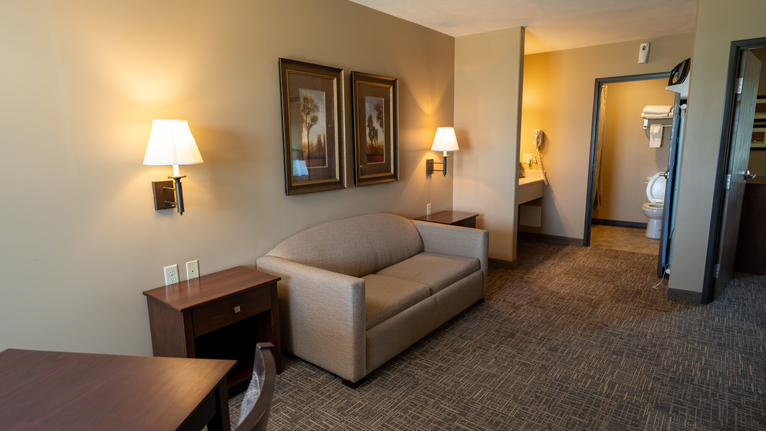Ample room for a comfortable stay with a couch, desk, table, and one king bed.